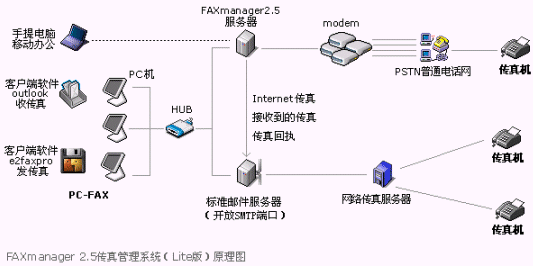 FAXmanager 2.5支持網(wǎng)絡(luò)傳真發(fā)送,具有內(nèi)嵌的網(wǎng)絡(luò)傳真服務(wù),價(jià)格比IP電話更加低廉。FAXmanager 2.5企業(yè)郵件管理系統(tǒng)有支持普通Modem的普通版本Lite版本,最多可以支持4只Modem,在局域網(wǎng)中的應(yīng)用請(qǐng)參見(jiàn)如下示意圖: