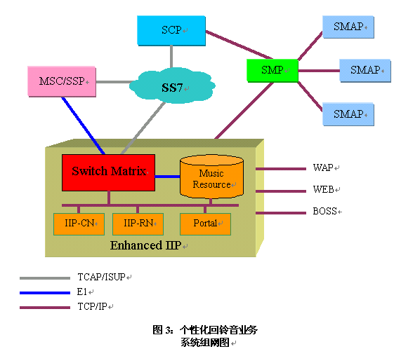 個(gè)性化回鈴音業(yè)務(wù)是基于智能網(wǎng)平臺實(shí)現(xiàn)的全新增值智能業(yè)務(wù),采用被叫簽約信息T-CSI觸發(fā)的方式。具體實(shí)現(xiàn)時(shí)利用現(xiàn)有智能網(wǎng)結(jié)構(gòu),將業(yè)務(wù)邏輯加載在SCP上,MSC/SSP根據(jù)用戶的歸屬HLR中的T-CSI信息,觸發(fā)智能業(yè)務(wù)到用戶歸屬的SCP上,并進(jìn)行相應(yīng)的業(yè)務(wù)控制處理。在呼叫過程中,由SCP控制獨(dú)立IP,向用戶提供音樂回鈴音。其中的Switch