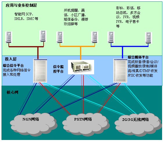 東方通信為增值業(yè)務(wù)開(kāi)發(fā)商提供了全面的接入層解決方案,同一平臺(tái)全面提供2G/3G/NGN領(lǐng)域信令、交換、媒體處理功能,系列化產(chǎn)品滿(mǎn)足用戶(hù)不同容量的需求。平臺(tái)在網(wǎng)絡(luò)中的位置如下圖所示: