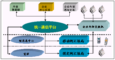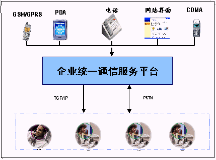 統(tǒng)一通信平臺提供了與企業(yè)內(nèi)部交換機(jī)(PBX)或PSTN,寬帶或INTERNET和GSM或GPRS網(wǎng)絡(luò)的接口,融合了多種網(wǎng)絡(luò)資源和企業(yè)內(nèi)部數(shù)據(jù)源。為用戶提供了多種服務(wù)界面:WEB界面、人工服務(wù)界面,IVR界面。同時為用戶提供短信息等數(shù)據(jù)業(yè)務(wù)。