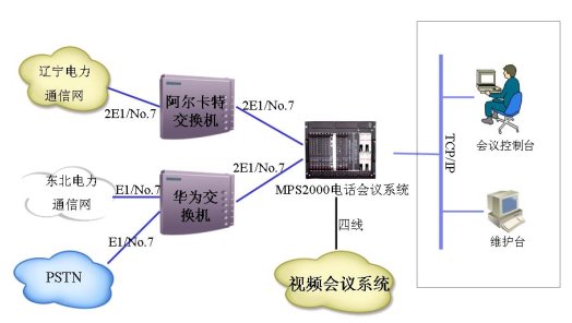 東北電網(wǎng)公司的電話會(huì)議系統(tǒng)中的120方會(huì)議橋通過4個(gè)E1采用中國(guó)七號(hào)信令與其原有的PABX相連,同時(shí)會(huì)議橋通過以太網(wǎng)與公司的內(nèi)部局域網(wǎng)相連,并在局域網(wǎng)內(nèi)設(shè)置一臺(tái)維護(hù)終端用于對(duì)系統(tǒng)的維護(hù)管理,局域網(wǎng)內(nèi)另一臺(tái)計(jì)算機(jī)可作為會(huì)議控制臺(tái)。電話會(huì)議終端直接與PABX相連。