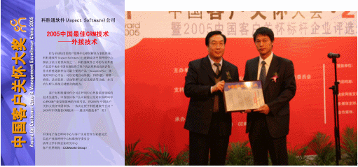 中國(guó)電子商會(huì)呼叫中心與客戶關(guān)系管理委員會(huì)、信息產(chǎn)業(yè)部呼叫中心標(biāo)準(zhǔn)指導(dǎo)委員會(huì)、清華大學(xué)中國(guó)企業(yè)研究中心和客戶世界機(jī)構(gòu)在獲獎(jiǎng)通知書中寫道,"作為全球知名的客戶聯(lián)絡(luò)中心整體解決方案的提供商,Aspect Software®已逐漸成為中國(guó)呼叫中心解決方案主要供應(yīng)商之一?苿偻ㄜ浖镜膶I(yè)外撥產(chǎn)品近年來在中國(guó)市場(chǎng)取得了客戶的認(rèn)同和較高的評(píng)價(jià);作為科勝通軟件公司最主要的產(chǎn)品-EnsemblePro一體化呼叫中心平臺(tái),可以實(shí)現(xiàn)自動(dòng)外撥,IVR外撥,郵件群發(fā),錄音監(jiān)控,活動(dòng)管理與自定義報(bào)表等功能,并具有與呼入系統(tǒng)無縫整合的能力;趯(duì)科勝通軟件公司在呼叫中心外撥系統(tǒng)領(lǐng)域的技術(shù)先進(jìn)性、中國(guó)地區(qū)客戶認(rèn)可程度以及對(duì)中國(guó)呼叫中心和CRM產(chǎn)業(yè)發(fā)展影響的全面考量,經(jīng)2005年中國(guó)客戶關(guān)懷大獎(jiǎng)評(píng)審團(tuán)審核,一致決定授予科勝通軟件公司"2005年中國(guó)最佳CRM技術(shù)--最佳外撥技術(shù)" 獎(jiǎng)!"