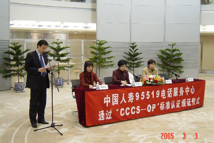 下午2點(diǎn),在中國(guó)人壽保險(xiǎn)股份有限公司總部舉行了隆重的頒證儀式。中國(guó)人壽保險(xiǎn)股份有限公司總部及江蘇、四川、深圳分公司的95519呼叫中心順利通過CCCS標(biāo)準(zhǔn)認(rèn)證。其中,中國(guó)人壽總部及江蘇省分公司95519呼叫中心獲準(zhǔn)CCCS五星級(jí)認(rèn)證評(píng)定,四川省及深圳市95519呼叫中心獲準(zhǔn)CCCS四星級(jí)認(rèn)證評(píng)定。