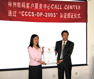 2005年6月2日,神州數(shù)碼呼叫中心通過了《全國呼叫中心運營績效標準》(CCCS-OP-2003)認證,并獲得由中國信息化推進聯(lián)盟客戶關(guān)系管理專業(yè)委員會頒發(fā)的認證證書(四星級客戶服務中心),成為國內(nèi)IT行業(yè)首家通過此認證的呼叫中心。