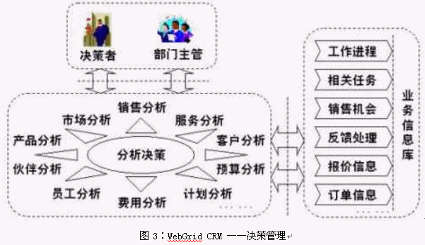 決策是企業(yè)管理者必須經(jīng)常進(jìn)行的工作。決策對(duì)企業(yè)的意義十分重大,可以說決策水平的高低,決定了企業(yè)的競(jìng)爭(zhēng)力。然而,要想做出科學(xué)、正確的決策,就離不開對(duì)歷史和現(xiàn)實(shí)信息的分析。WebGrid CRM將企業(yè)的各種業(yè)務(wù)統(tǒng)一存儲(chǔ)在業(yè)務(wù)信息數(shù)據(jù)庫之中,這樣就為企業(yè)針對(duì)業(yè)務(wù)進(jìn)展情況作定量分析打下了堅(jiān)實(shí)的基礎(chǔ)。WebGrid CRM同時(shí)提供了多種分析工具,可以方便的對(duì)客戶、產(chǎn)品、進(jìn)程、任務(wù)、預(yù)算、計(jì)劃、費(fèi)用等等信息進(jìn)行分類統(tǒng)計(jì),用以分析銷售、市場(chǎng)和服務(wù)業(yè)務(wù)的運(yùn)行情況,從而做出科學(xué)、正確的決策。