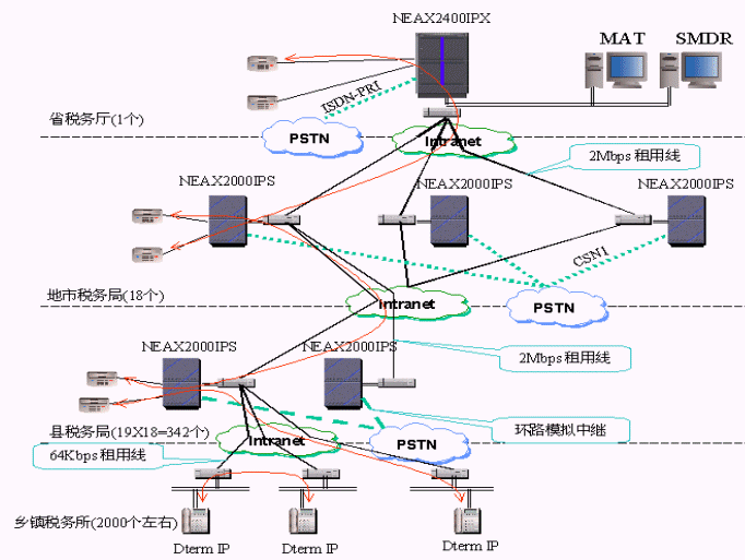 NEC公司為該省稅務(wù)提供了2003年全球同步推出的NEAX 2400及NEAX2000交換機(jī)系統(tǒng),為用戶提供了傳統(tǒng)時(shí)分交換系統(tǒng)和VoIP交換的完美結(jié)合,即具備VoIP功能又支持交換機(jī)的豐富功能,如豐富的終端,豐富的組網(wǎng)中繼和信令,語音信箱,多方會(huì)議,無線通信,統(tǒng)一計(jì)費(fèi)等等。
