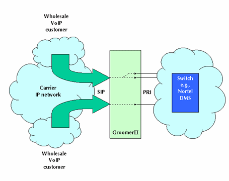 圖1中的GroomerII支持PRI協(xié)議,如:NI-2、ETS300和INS1500等,可以實現(xiàn)網(wǎng)關(guān)的功能把運營商自己的電路交換網(wǎng)和IP網(wǎng)絡(luò)相互連接在一起。這種設(shè)置允許網(wǎng)絡(luò)運營商向其他業(yè)務(wù)供應(yīng)商提供批量VoIP業(yè)務(wù)。這類業(yè)務(wù)運營商據(jù)此可以向他們的客戶提供具有區(qū)分性的業(yè)務(wù),如:利用SIP電話呼叫等。