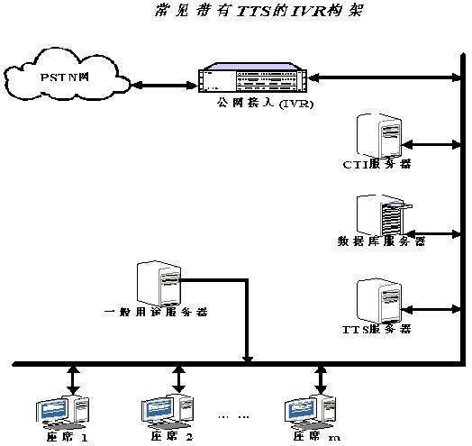 在一般的CTI應(yīng)用系統(tǒng)中,都會有IVR(交互式語音應(yīng)答系統(tǒng))。IVR系統(tǒng)是呼叫中心的重要組成部分,通過IVR系統(tǒng),用戶可以利用音頻按健電話輸入信息,從系統(tǒng)中獲得預(yù)先錄制的數(shù)字或合成語音信息。具有TTS功能的IVR可以加快服務(wù)速度,節(jié)約服務(wù)成本,使IVR為呼叫者提供7*24小時的服務(wù)。