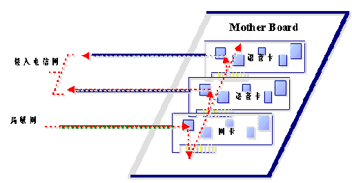 通過局域網(wǎng)傳遞語音數(shù)據(jù)本來就不能保證其時實(shí)時性,其結(jié)果就是用戶聽到的語音經(jīng)常斷續(xù),保證不了語音質(zhì)量。如果傳遞的語音數(shù)據(jù)是經(jīng)過壓縮的,語音數(shù)據(jù)本來就是通過TTS進(jìn)行合成的,再經(jīng)過壓縮,則音質(zhì)會有很大的損傷,因此同樣保證不了語音質(zhì)量。從上圖中我們可以看到,經(jīng)TTS合成的語音數(shù)據(jù)從局域網(wǎng)經(jīng)過網(wǎng)卡,再通過主板PCI(或ISA)總線進(jìn)入語音卡,最后進(jìn)入電信網(wǎng),同樣語音數(shù)據(jù)通過計算機(jī)主板經(jīng)PCI(或ISA)總線進(jìn)入語音卡也要求是實(shí)時的。這兩種實(shí)時性的要求會導(dǎo)致在接入量比較大的情況下,會給計算機(jī)的總線造成很大的負(fù)擔(dān)。因?yàn)榭偩的帶寬(數(shù)據(jù)吞吐量)是有限的。況且其它的板卡和接口(如聲卡、顯示卡等)也要直接或間接地占用總線。因此在接入量比較大的情況下,計算機(jī)的總線帶寬會成為一個比較關(guān)鍵的瓶頸。即便提高語音板卡的接入能力。在有大量電話接入的情況下,由于語音數(shù)據(jù)實(shí)時性的要求,也不能保證語音質(zhì)量。