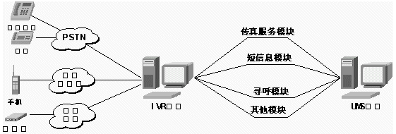 TTS系統(tǒng)、VXML系統(tǒng)、UMS系統(tǒng)與已有IVR(電話語(yǔ)音自動(dòng)應(yīng)答系統(tǒng))平臺(tái)、Internet、PSTN結(jié)合的示示意圖如下: