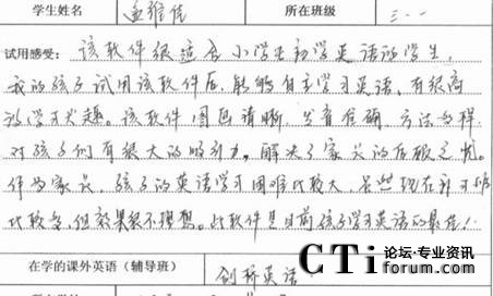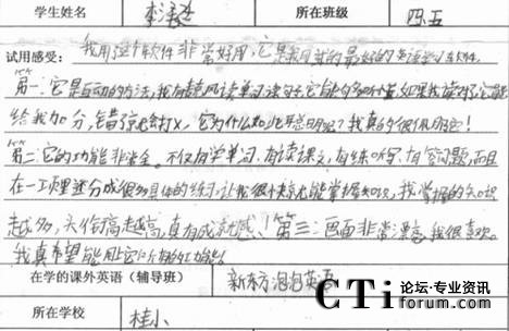 CTI論壇(ctiforum)1月21日消息(記者 潘婷婷):2010年12月,科大訊飛在天津市的兩所小學(xué)舉辦了暢言互動英語學(xué)生版試用體驗活動,同學(xué)們積極參與,在校園內(nèi)掀起了一股練聽力、學(xué)口語的英語學(xué)習(xí)熱潮。通過實際試用體驗,暢言互動英語學(xué)生版學(xué)習(xí)產(chǎn)品以其強大、實用的學(xué)習(xí)功能,得到了廣大家長、學(xué)校師生的一致認(rèn)可和充分肯定。