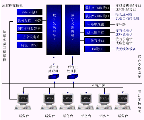 "前臺座席系統(tǒng)"包括班長臺和話務(wù)臺,均采用微機(jī),運用先進(jìn)的計算機(jī)聯(lián)網(wǎng)技術(shù),將它們通過網(wǎng)絡(luò)與"后臺交換系統(tǒng)"相連。班長臺和所有話務(wù)臺的硬件連接完全相同,任何一臺損壞,不影響其它話務(wù)臺的使用,即不存在關(guān)鍵接點,提高了系統(tǒng)的安全可靠性。全漢化圖形界面,交互式人機(jī)操作方式,簡單明了,易于掌握。所有話務(wù)臺均為集記錄、查號、市話轉(zhuǎn)接、長話轉(zhuǎn)接為一體的綜合型人工話務(wù)臺,所有功能由數(shù)據(jù)定義,可分可合,可方便的進(jìn)行設(shè)置,也可臨時并席,為系統(tǒng)高質(zhì)量的服務(wù)提供了可靠的基礎(chǔ)。所有話票均在計算機(jī)上填寫,由網(wǎng)絡(luò)自動傳送,不再使用紙話票,也不需人工分發(fā)話票,極大的減輕了勞動強(qiáng)度,提高了辦事效率。為了減小系統(tǒng)規(guī)模,我們將查詢、計費、統(tǒng)計、管理、維護(hù)五種功能融合為一體,統(tǒng)一成為多功能的班長臺,其功能亦可分可合,視用戶需求而定。