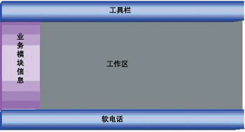 軟電話提供標準的呼叫控制功能,如座席的登錄、注銷等。業(yè)務(wù)模塊信息根據(jù)該座席的技能設(shè)置顯示該座席能夠使用的座席業(yè)務(wù)模塊,工作區(qū)是座席使用業(yè)務(wù)模塊的區(qū)域,業(yè)務(wù)模塊的調(diào)入可以是系統(tǒng)根據(jù)自動服務(wù)傳遞的參數(shù)自動彈出,也可以是座席人員手工選擇相應的業(yè)務(wù)操作。同時,業(yè)務(wù)模塊通過標準的接口和軟電話模塊進行通信,取得或者設(shè)置系統(tǒng)的呼叫參數(shù)或操作,包括提取系統(tǒng)主被叫號碼、用戶按鍵等。通過工具欄提供系統(tǒng)的菜單、快捷鍵、快捷按鈕的使用。通過這種方式,系統(tǒng)可以隨時增加、修改座席的業(yè)務(wù)模塊,而無須修改整個座席端,有利于系統(tǒng)業(yè)務(wù)的分步實施,大大縮短了系統(tǒng)的整個建設(shè)周期。