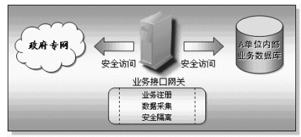 為了實現(xiàn)企業(yè)基礎(chǔ)信息交換與共享,各個接入平臺的單位必須將需要提供給其他單位的企業(yè)數(shù)據(jù)共享出來,基于安全、保密等多種因素考慮,這些單位的業(yè)務(wù)數(shù)據(jù)庫不可以也不應(yīng)該對其他單位完全開放(也就是直接連在政府專網(wǎng)上),而業(yè)務(wù)接口網(wǎng)關(guān)的作用就是將業(yè)務(wù)數(shù)據(jù)庫與政府專網(wǎng)之間的隔離、實現(xiàn)業(yè)務(wù)注冊以及數(shù)據(jù)采集等功能。業(yè)務(wù)接口網(wǎng)關(guān)的兩個網(wǎng)絡(luò)端口分別連接業(yè)務(wù)數(shù)據(jù)庫以及政府專網(wǎng),機關(guān)單位將它們業(yè)務(wù)數(shù)據(jù)庫中需要共享的業(yè)務(wù)數(shù)據(jù)項名稱注冊到信息中心的業(yè)務(wù)注冊庫中,其他機關(guān)單位通過查詢業(yè)務(wù)注冊庫獲取對方單位的業(yè)務(wù)注冊信息,并通過自己的業(yè)務(wù)接口網(wǎng)關(guān)向信息交換機發(fā)出業(yè)務(wù)數(shù)據(jù)采集的要求,信息交換機接收請求后對請求進行校驗,校驗通過后信息交換機會通過被采集業(yè)務(wù)數(shù)據(jù)庫所在單位的業(yè)務(wù)接口網(wǎng)關(guān)獲取業(yè)務(wù)數(shù)據(jù),數(shù)據(jù)通過信息交換機交換到采集單位的業(yè)務(wù)接口網(wǎng)關(guān),此時采集單位可以將數(shù)據(jù)保存在己方的采集數(shù)據(jù)庫中,或者直接由應(yīng)用系統(tǒng)使用。