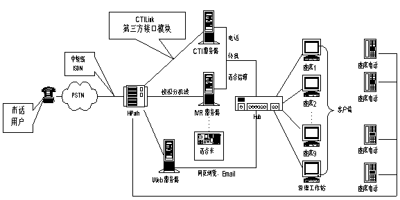 企業(yè)級(jí)統(tǒng)一消息平臺(tái),它將交換技術(shù)、CTI技術(shù)、INTERNET技術(shù)合理地應(yīng)用到系統(tǒng)中,包含了基于數(shù)據(jù)庫的智能化呼叫分配(ACD)、交互式語音應(yīng)答(IVR)、傳真服務(wù)器(Fax