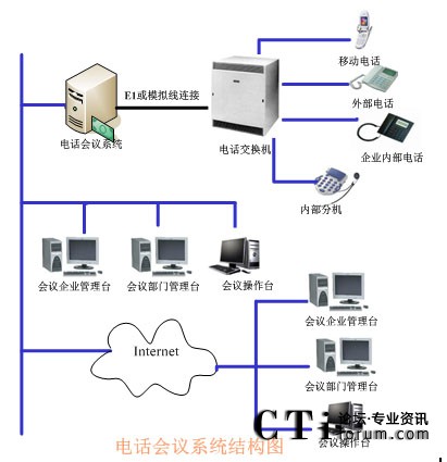 TalenTel CNF電話會議系統(tǒng)可以與程控交換機配合使用,也可以直接與局方的系統(tǒng)進行連接,系統(tǒng)的構(gòu)成含如下幾部分:TalenTel CNF電話會議系統(tǒng)服務器(ctsIVR)、會議企業(yè)管理員模塊、會議部門管理員模塊、會議操作員管理模塊、數(shù)據(jù)庫等組成。