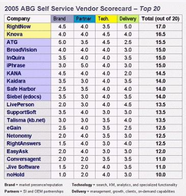 RightNow在所有20家廠商中以17分的高分名列第一(詳情請(qǐng)見http://www.selfservicescorecard.com/)。根據(jù)ABG的報(bào)告,得分超過(guò)16的廠商為當(dāng)前市場(chǎng)的領(lǐng)導(dǎo)者。得分超過(guò)14的廠商為10大重要廠商。