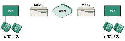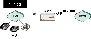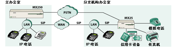 MX25 是一種能夠在兩種不同模式下工作的模塊化設備。在其中一種工作模式下,MX25 是一個通向 PSTN 網(wǎng)關的獨立 SIP。當在這種模式下工作時,MX25 轉(zhuǎn)換電話呼叫的格式,使其可以在 IP 網(wǎng)絡與公用電話網(wǎng)絡之間傳遞。另一種工作模式是,將 MX25 作為 MX250 的功能延伸系統(tǒng),用于不超過 25 個用戶的分支辦公室。在這種配置下,MX25 與 MX250 通信并交換有關用戶和設備的信息。即使連接 MX250 和 MX25 的 WAN 鏈路出現(xiàn)故障,MX25 也能繼續(xù)工作并處理來自/發(fā)往 PSTN 的傳入/傳出呼叫。
