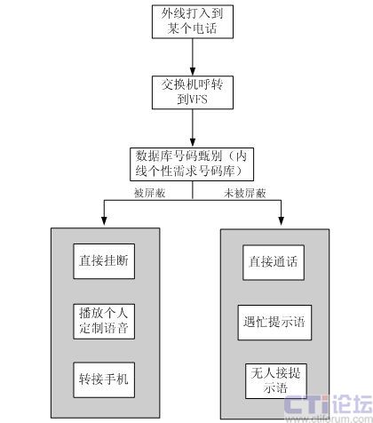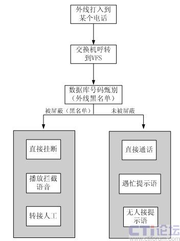 基本技術(shù)特點    外線(主叫)撥打某一電話(被叫),在經(jīng)過VFS系統(tǒng)數(shù)據(jù)庫甄別后,如果該外線(主叫)存在于主叫屏蔽號碼段的黑名單數(shù)據(jù)庫中,該外線(主叫)將會被系統(tǒng)自動屏蔽。如被屏蔽,則根據(jù)流程動作,可以播放提示音、轉(zhuǎn)接人工或者直接掛斷。