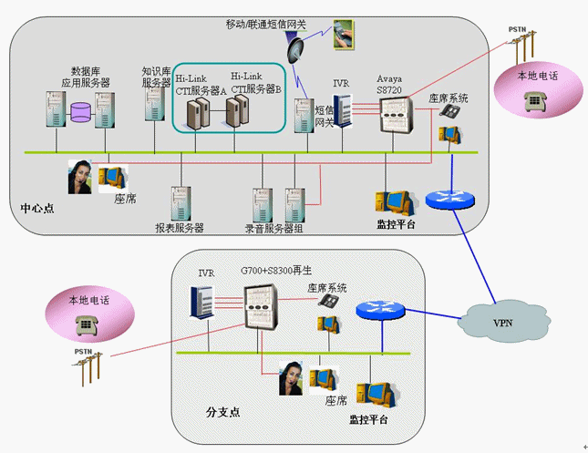 整個網(wǎng)路可以劃分為Internet接入部分、電話接入部分、CTI系統(tǒng)內(nèi)網(wǎng)、辦公網(wǎng)絡和座席系統(tǒng)5個部分。Internet接入部分實現(xiàn)網(wǎng)絡訪問的受理和轉發(fā);電話接入部分完成電話語音和傳真的接續(xù)和處理;CTI系統(tǒng)內(nèi)網(wǎng)完成電話呼叫的控制和應用的集成;座席系統(tǒng)部分完成語音和控制信息的接收和處理,為座席提供通話能力和業(yè)務處理能力。