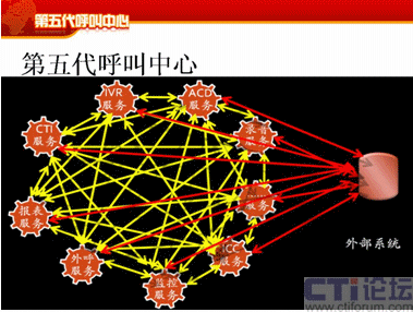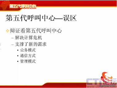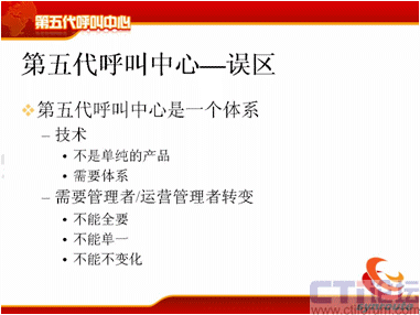 下面我提第五代呼叫中心的誤區(qū),首先我們要辯證地看第五代呼叫中心,剛才好像我在解決問題,這個(gè)呼叫中心的計(jì)算危機(jī)產(chǎn)生了,我在解決計(jì)算危機(jī)的問題,但是大家要反著想,我把這個(gè)問題解決了,我按這種方式去架構(gòu)了,這時(shí)候它的業(yè)務(wù)模式就能支持到非常豐富了,而以前的業(yè)務(wù)模式,業(yè)務(wù)的創(chuàng)造為什么進(jìn)行不下去?我們不能說全部都是因?yàn)镮T系統(tǒng),但是IT系統(tǒng)占很大的一個(gè)部分,其實(shí)就是因?yàn)橥顿Y的部分,如果你有足夠錢的話,可以實(shí)現(xiàn)足夠的想法。第二個(gè)方面通信方式也是一樣,通信方式也是你可以支持更多的通信方式,你可以將3G的視頻加上去,你可以將很多業(yè)務(wù)加進(jìn)去,你可以把固定點(diǎn)報(bào)警加上去,你可以把IPTV的業(yè)務(wù)方式加上去,管理模式也一樣,你可以不斷地調(diào)整,這個(gè)調(diào)整只要是在框架一定范圍內(nèi)不斷地調(diào)整都可以支持,那么對(duì)于運(yùn)營(yíng)管理也能同樣進(jìn)行有效的支持。