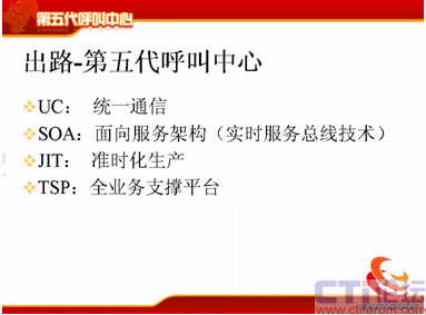 迎接第五代呼叫中心的挑戰(zhàn),重申一下,第五代呼叫中心的四個(gè)特性:UC統(tǒng)一通信的;SOA面向服務(wù)架構(gòu)和實(shí)時(shí)服務(wù)總線技術(shù);JIT的準(zhǔn)時(shí)化生產(chǎn);TSP全業(yè)務(wù)平臺(tái)。