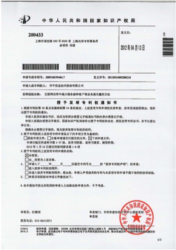 圖為: 互聯(lián)網(wǎng)應用中減少服務器和客戶端業(yè)務通訊量的方法專利授權書