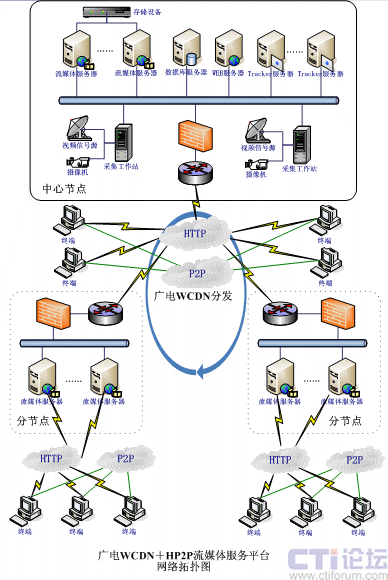 根據(jù)以上情況,廣電系統(tǒng)的流媒體服務(wù)平臺采用VIEWGOOD流媒體服務(wù)平臺,利用HP2P、WCDN技術(shù)進行分級部署;以下給出網(wǎng)絡(luò)拓撲圖: