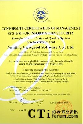 CTI論壇(ctiforum)07月17日消息: 日前,VIEWGOOD順利通過ISO27001信息安全管理體系國(guó)際認(rèn)證,成為首家通過該項(xiàng)認(rèn)證的專業(yè)流媒體技術(shù)供應(yīng)商。此舉標(biāo)志著VIEWGOOD在保障信息安全、提升企業(yè)管理水平方面,已經(jīng)全面接軌國(guó)際水平,并居于業(yè)內(nèi)領(lǐng)先地位。