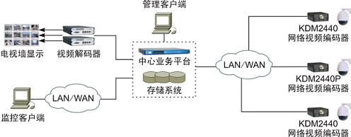 KDM2440/2440P可作為網(wǎng)絡(luò)視頻監(jiān)控系統(tǒng)的智能化前端接入單元,與攝像機(jī)一起實現(xiàn)監(jiān)控點的集成化部署,攝像機(jī)采集的模擬視頻信號經(jīng)編碼處理后以IP碼流形式上傳至中心業(yè)務(wù)平臺,在監(jiān)控客戶端的管理和控制下,中心業(yè)務(wù)平臺將上傳的碼流按需轉(zhuǎn)發(fā)到監(jiān)控客戶端、視頻解碼器以及網(wǎng)絡(luò)錄像單元,分別實現(xiàn)PC瀏覽、電視墻顯示以及錄像存儲。