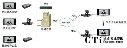 2009年6月,領(lǐng)先的視訊廠商科達(dá)攜TrueSens(致勝)視頻會(huì)議系統(tǒng)走進(jìn)海瀾,為海瀾集團(tuán)搭建了一套覆蓋總部2個(gè)領(lǐng)導(dǎo)辦公室、1個(gè)銷售會(huì)議室及全國32個(gè)分公司的視頻會(huì)議系統(tǒng)。整個(gè)方案在部署上非常便捷,海瀾江陰總部的機(jī)房架設(shè)一臺(tái)高、標(biāo)清一體化多點(diǎn)控制單元(MCU),銷售會(huì)議室、集團(tuán)王總、陶總的辦公室以及海瀾集團(tuán)在全國的32個(gè)分公司銷售會(huì)議室則各部署一套視頻會(huì)議終端。總部帶寬為100M,分支機(jī)構(gòu)則均通過普通ADSL接入。系統(tǒng)拓?fù)鋱D如下:
