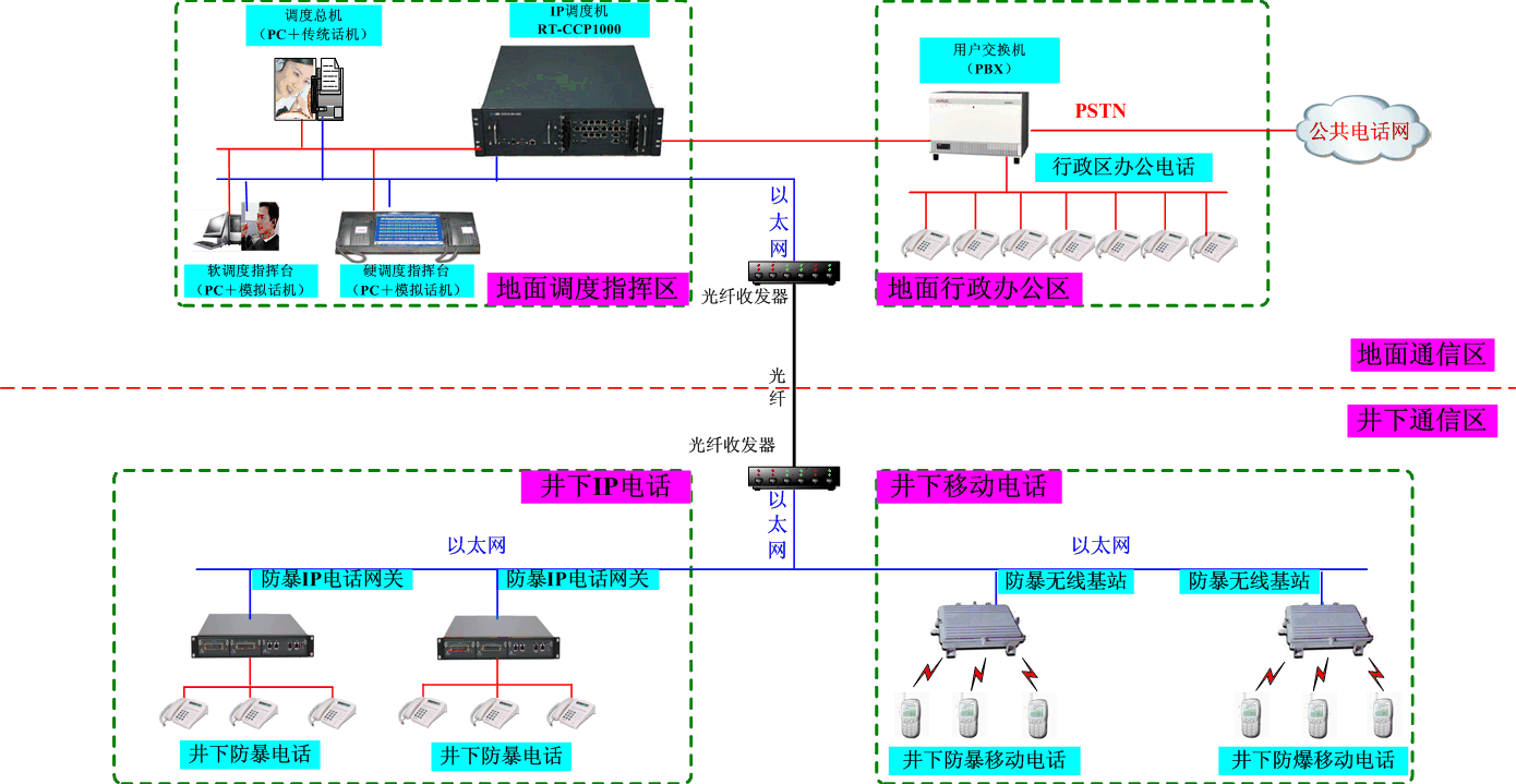 在傳統(tǒng)調(diào)度技術(shù)基礎(chǔ)上完美的將固話網(wǎng)絡(luò)、IP網(wǎng)絡(luò)、無線網(wǎng)絡(luò)充分融合,可以實現(xiàn)井上調(diào)度指揮區(qū)及井上行政辦公區(qū)、井下IP電話及井下移動電話的互通,也能提供接口與原有的行政辦公電話無縫整合。同時也完美的解決了不同網(wǎng)絡(luò)之間、多套系統(tǒng)之間存在兼容性差、共享性差、重復(fù)投資、操作復(fù)雜等諸多缺陷。
