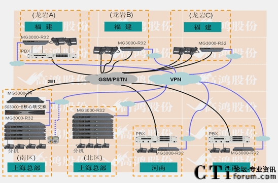 - 上海接入采用電信30B+D線路兩條。使用2E1的MG3000-T4設備接入。上海南區(qū)IP分機600門,北區(qū)IP分機300門,全部采用MG3000-R32(32FXS)設備做接入。福建龍巖A、B、C,江西高安,河南鄭州這5個分支分別采用16FXO口網(wǎng)關與PBX或電信虛擬網(wǎng)直線互聯(lián)。