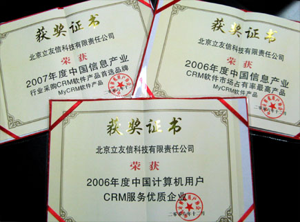 2007年1月16日,中國計算機用戶協(xié)會在京召開隆重而盛大的年度頒獎儀式。MyCRM在本次會上榮獲殊榮,一舉囊括了“2006年度中國信息產(chǎn)業(yè)CRM 軟件市場占有率最高產(chǎn)品”,“ 2006年度中國計算機用戶CRM服務(wù)優(yōu)質(zhì)企業(yè)”和“2007 年度中國信息產(chǎn)業(yè)行業(yè)采購CRM軟件產(chǎn)品首選品牌”。本次獲獎充分體現(xiàn)了MyCRM在CRM市場的全面領(lǐng)先優(yōu)勢。