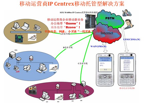 企業(yè)通信總機必須具備PBX或CENTREX特性,也就是要具備外部的電話呼入和內(nèi)部分機之間的呼叫控制和交換轉(zhuǎn)接等等功能。IT互聯(lián)網(wǎng)信息時代的今天,傳統(tǒng)的PBX或CENTREX已經(jīng)不能滿足更多的企業(yè)移動性辦公、語音數(shù)據(jù)融合通信以及各種通信協(xié)同工作模式的需要。盡管前兩年移動運營商也推出了移動總機,但也僅僅實現(xiàn)了手機可以接聽總機的來電而已,尚且還有很多在今天互聯(lián)網(wǎng)與電信網(wǎng)融合的時代企業(yè)的實際應用需求無法滿足。融合通信的時代急切呼喚著融合、移動的企業(yè)通信總機和分機的出現(xiàn),SOX-M融合通信移動總機和移動分機應時代的召喚問世了。