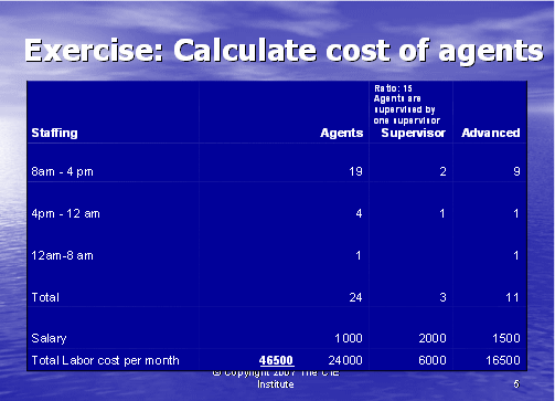 我們下一步就是計(jì)算出主管的成本。每次排班至少需要一個(gè)主管,如果這一排班的座席數(shù)要少一些,主管則也應(yīng)該能夠處理一些技術(shù)支持的電話。在這個(gè)例子中,我們將假設(shè)主管擁有高級(jí)支持座席的技術(shù)技巧。在圖表5中,你將看到我們使用了圖表4所得出的座席數(shù),并假設(shè)這是每次排班話務(wù)量中所需的各種類型員工的數(shù)量:基礎(chǔ),高級(jí)和主管。我們同時(shí)用圖表1中的薪資去計(jì)算座席和主管支持400個(gè)客戶的總成本。通過把每種座席單獨(dú)的成本相加(24個(gè)基礎(chǔ)座席,11個(gè)高級(jí)座席和3個(gè)主管),得出每月的人工成本為46,500美元。