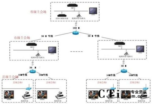 本方案整體采用基于IP網(wǎng)絡(luò),在省、市中心機房放置MCU,通過網(wǎng)線接入核心交換網(wǎng)絡(luò);在會議室放置視頻終端,通過郵政專網(wǎng)進(jìn)行互聯(lián)。一級系統(tǒng)以省中心會議室為主會場,下屬各市會議室為分會場組成邏輯星形拓?fù)浣Y(jié)構(gòu);二級系統(tǒng)以市州郵政局會議室為主會場,下屬各區(qū)縣郵政局會議室為分會場。兩級系統(tǒng)通過MCU級聯(lián)互通,形成一個樹形的拓?fù)浣Y(jié)構(gòu)。系統(tǒng)主要由全視頻會議管理系統(tǒng)、純硬件MCU、純硬件1080P高清會議終端等組成,采用MCU為中心的星形結(jié)構(gòu)建立一個數(shù)字連接的、專業(yè)的視頻會議系統(tǒng)。視頻會議系統(tǒng)可由省郵政廳視頻會議中心控制,任意切換參會市、州(分中心)、縣、市、區(qū)(終端)的會議畫面。視頻會議系統(tǒng)可以指定任意參會單位發(fā)言并實現(xiàn)全省會場統(tǒng)一的畫面切換。視頻會議系統(tǒng)可實現(xiàn)省郵政局集中控制與管理,易于使用,能進(jìn)行遠(yuǎn)程管理、遠(yuǎn)程維護、可降低維護成本。通過授權(quán),各級單位可自行組織、控制會議,方便各級單位的使用。