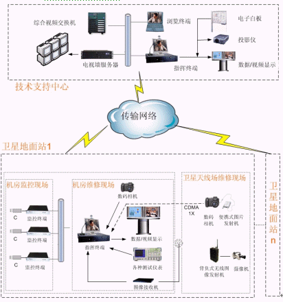 某通信部門為了解決高新技術(shù)設(shè)備的不斷增加和與之相適應(yīng)的技術(shù)維修力量嚴(yán)重不足的矛盾,最大限度地實(shí)現(xiàn)技術(shù)專家的資源共享,降低維修成本、提高工作效率,采用北京華緯訊電信技術(shù)有限公司研制、生產(chǎn)的VC3-6000視頻指揮調(diào)度系統(tǒng),建設(shè)了一套遠(yuǎn)程技術(shù)支持系統(tǒng),其組網(wǎng)拓?fù)鋱D見下圖。