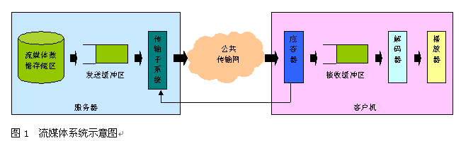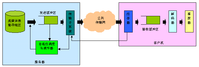 實(shí)時(shí)自適應(yīng)網(wǎng)絡(luò)帶寬的流媒體傳送技術(shù),是上海清鶴數(shù)碼科技公司的一項(xiàng)可大幅提高流媒體寬帶傳送過程中的關(guān)鍵服務(wù)質(zhì)量瓶頸的國(guó)際技術(shù)專利。我們知道,目前制約流媒體寬帶應(yīng)用發(fā)展的核心問題在于服務(wù)質(zhì)量。簡(jiǎn)單地說,由于因特網(wǎng)的狀況是不可靠的,其帶寬、負(fù)荷等變化劇烈,這難以滿足流媒體寬帶業(yè)務(wù)的實(shí)時(shí)性服務(wù)質(zhì)量要求,并常常造成播放卡殼、延遲、視頻質(zhì)量抖動(dòng)劇烈等不良情況,給使用者感官造成很大影響。所以解決好流媒體寬帶應(yīng)用的服務(wù)質(zhì)量問題對(duì)于流媒體寬帶應(yīng)用是極為重要的。如圖1所示,在一般的流媒體寬帶系統(tǒng)里,視頻服務(wù)器通過網(wǎng)絡(luò)向客戶機(jī)實(shí)時(shí)傳送流媒體信息。