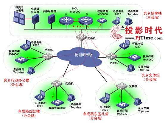 ME5000(配置32*768K)型MCU,在主會(huì)場(chǎng)及各分會(huì)場(chǎng)會(huì)議室共配置9臺(tái)高清會(huì)議室型會(huì)議終端(MG6060)和4臺(tái)標(biāo)清會(huì)議室終端(MG6030);同時(shí)學(xué)校領(lǐng)導(dǎo)桌面部署120部可視電話和12套桌面終端,具體視頻會(huì)議組網(wǎng)拓?fù)鋱D如下所示: