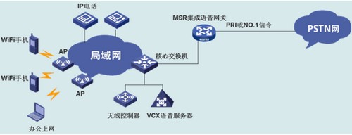 企業(yè)內(nèi)部部署WLAN和語音系統(tǒng)。企業(yè)員工使用WLAN/GSM雙模手機可在WLAN覆蓋區(qū)優(yōu)先通過WiFi網(wǎng)絡實現(xiàn)內(nèi)部通話,參加電話會議,也可撥打PSTN外線電話,代替座機和手機的功能。