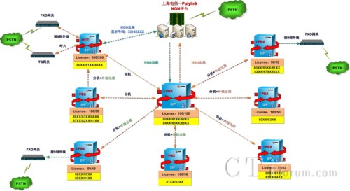 客戶采用IPCC-500型的IPCC系統(tǒng)組建一套分布式呼叫中心系統(tǒng)。它不僅實現(xiàn)呼叫中心功能,又完全取代傳統(tǒng)PBX作為核心的通信系統(tǒng)。客戶總部容量為300門分機,另有分支機構(gòu)分別配置一臺IX-100和IX-50,作為分公司的電話交換設(shè)備。外地分部使用IX-50通過互聯(lián)網(wǎng)與總部的IPCC點對點對接,實現(xiàn)內(nèi)部互通免費?蛻舻淖撕陀脩舳丝偣布s有550門終端。