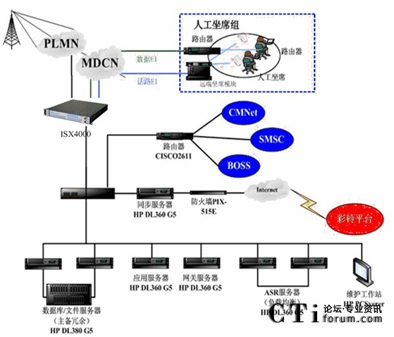 平臺核心話路接入集在中毅航通信iSX4000智能業(yè)務交換機的IVR自動語音平臺,人工坐席平臺通過和系統(tǒng)支撐軟件實現(xiàn)遠端坐席功能,通過專線中繼與IVR平臺實現(xiàn)話路連接;InterNet與IVR平臺實現(xiàn)數(shù)據(jù)同步。根據(jù)移動交換網(wǎng)傳輸內(nèi)容選擇應相的IVR自動語音服務或人工坐席服務。