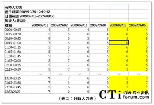 分時人力表在管理上有重要的地位,用于檢視時間內(nèi)排定的出席人數(shù),通常是將此數(shù)據(jù)與預測的話務需求做比對,檢查排定人力數(shù)與話務曲線的擬合度。在現(xiàn)場管理時,則用于小休調度,避免小休人數(shù)過多,使出席人數(shù)降到關鍵少數(shù)的臨界點下,造成服務水平大幅跌落的狀況發(fā)生。