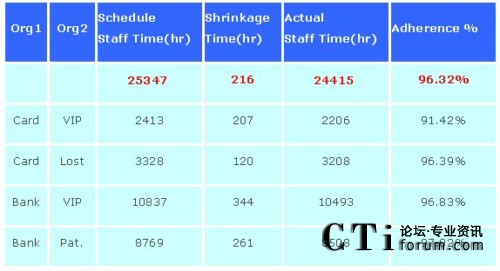缺點是,此報表顯示出的只是表定出席人數(shù),而非實際現(xiàn)場出席人數(shù),故在呼叫中心現(xiàn)場管理時,可導入具有遵時異常管理功能或座席監(jiān)控模塊之人力資源優(yōu)化系統(tǒng)(例如:Grandsys