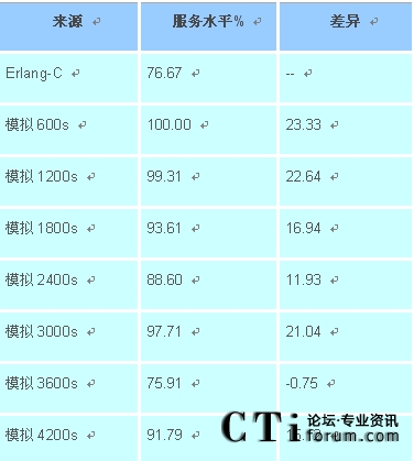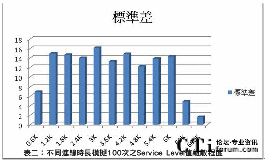 (表一:Erlang C與話務模擬之Service Level差異表)