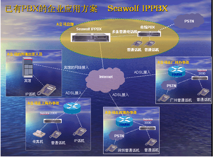 北京海狼網絡通信有限公司推出的Seawolf IPPBX解決方案切實從集團企業(yè)的利益出發(fā),為客戶成功地降低了通訊成本。Seawolf IPPBX是一款功能強大的小型語音交換平臺設備。它將傳統(tǒng)的交換機技術與VOIP的先進技術完美融合,提出了VOIP的企業(yè)級解決方案。此方案能大大縮減各大、中、小型企事業(yè)單位的通信費用,同時增加員工的工作效率。隨著產品的不斷普及,Seawolf IPPBX將成為企業(yè)辦公不可缺少的一部分。此方案適合于已經有PBX的公司,由于先期已經投入了PBX設備,費用昂貴,所以不會輕易被替換。在外地有多家分公司,使用傳統(tǒng)電話通訊費用很高,希望能降低成本。并希望在分公司所在城市可以通過當地的PSTN落地,節(jié)省長途費用。依照客戶的需求,我們制定了以下方案:海狼科技公司供稿 CTI論壇編輯