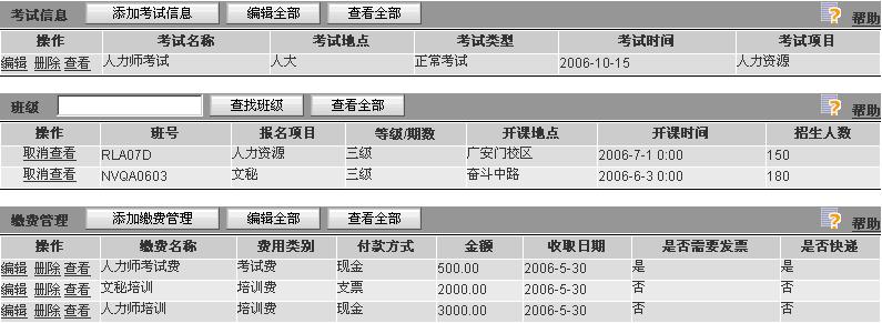 點擊單個學員查看頁面的相關列表,直接添加其他考務信息。張小玲是報名人力資源三級和文秘三級的學員,人力三級學習需要代辦考試。繳納人力培訓費3000元,文秘培訓2000元,報名人力資源管理師考試費500元。