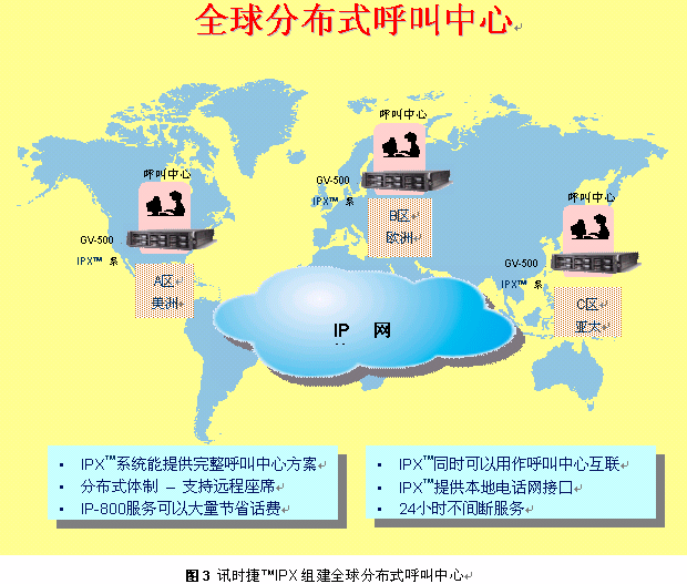 將客服人員辦公地點設(shè)立在人力成本相對低廉的地方,在其它需要有客服的地方架設(shè)帶FXO的語音網(wǎng)關(guān),將該網(wǎng)關(guān)注冊到訊時捷 IPX上,將當?shù)乜头娫捵詣愚D(zhuǎn)入到公司總部的訊時捷