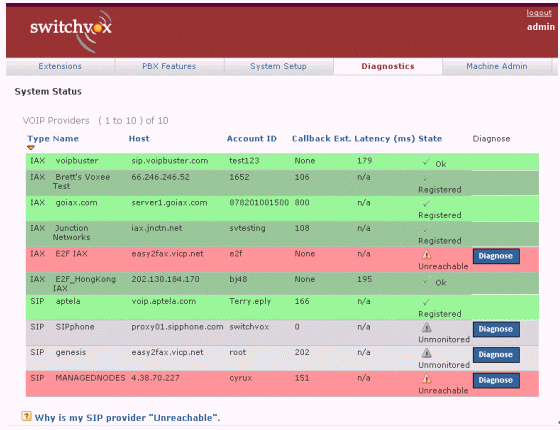 圖2中綠色表示正常,紅色表示出現(xiàn)問(wèn)題,白色表示從沒(méi)有接通過(guò)。如果你按診斷(Diagnose),系統(tǒng)便會(huì)通過(guò)自動(dòng)測(cè)試,告訴你問(wèn)題出自那一段落。如果需要對(duì)每一個(gè)的詳細(xì)解析,可以按底部Why這個(gè)標(biāo)題,找尋答案。類(lèi)似的終端、話(huà)機(jī)等配置、硬件診斷等,也有非常明撩的界面與解決問(wèn)題的辦法。